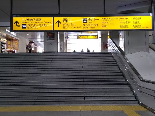 中央改札を右に出ていただくと西口に出れますので階段、エスカレーターでお上がりください。