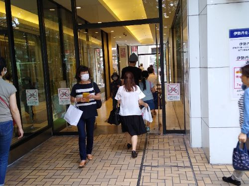 突き当りに伊勢丹さん、コルソさんの通路が右にありますのでお通りください。